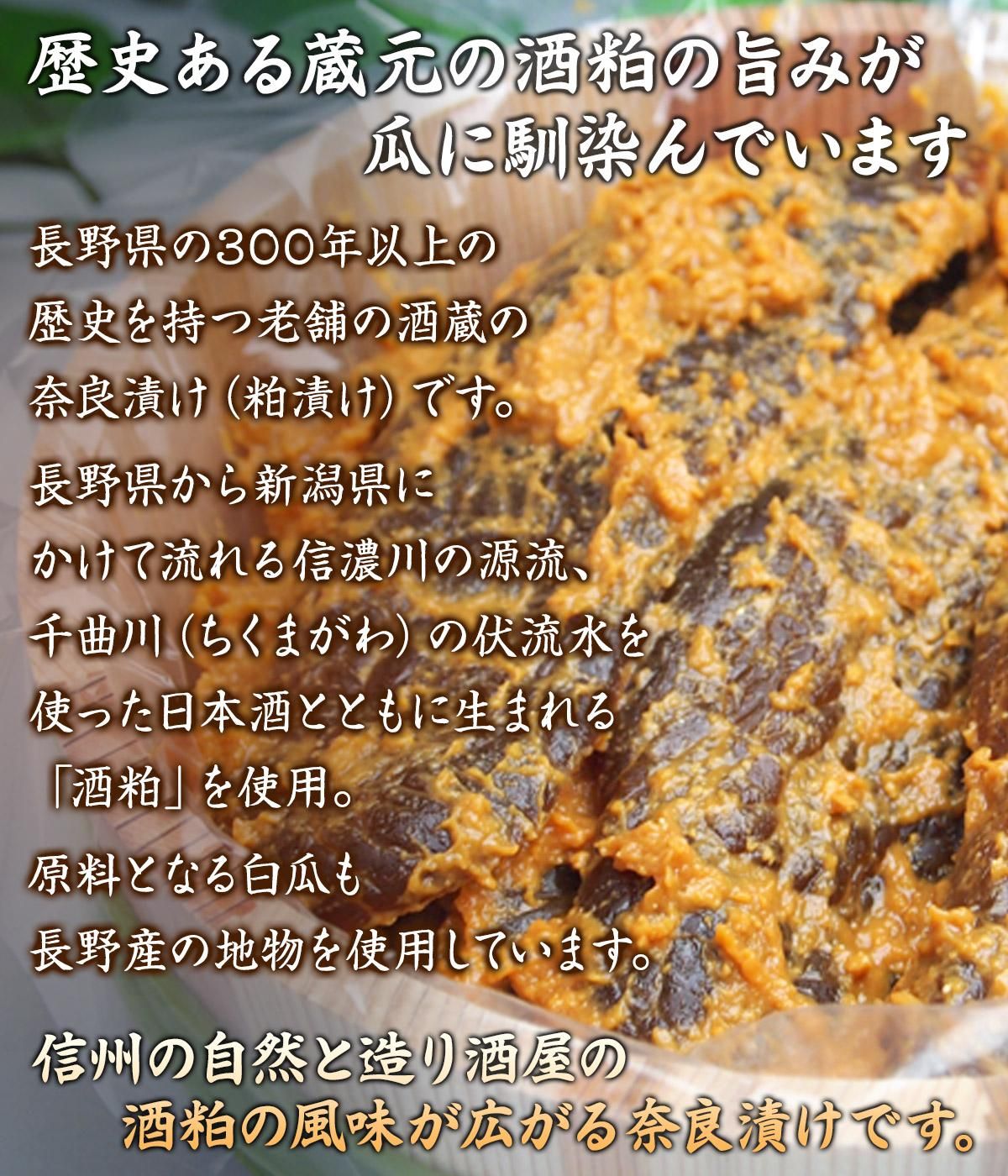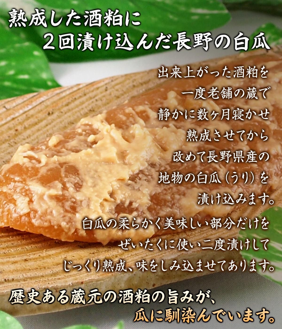 出来上がった酒粕を老舗の蔵で数ヶ月寝かせ、春にできた酒粕を夏まで熟成させてから、改めて長野県産の地物の白瓜(うり)を漬け込みます。